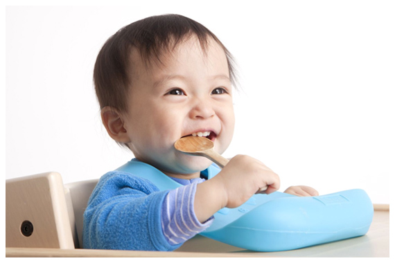 1歳になると、固形の食べ物を歯ぐきや歯でつぶして食べられるようになります。手づかみで食べようとしますが、食べる楽しさを体感できる経験なので、制止せずに食べさせてあげてください。食後は赤ちゃん用の歯ブラシを使ってお手入れすることで、食べた後はしっかりみがくという習慣の定着につながります。